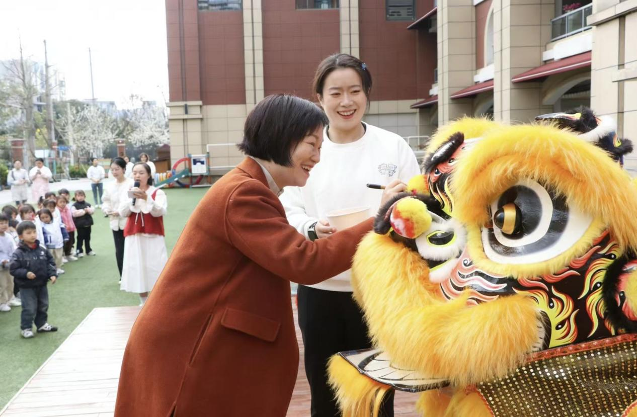 民俗环节则热闹非凡。祥狮登场,园长吴三平为雄狮点睛,寓意新学期吉祥启幕。孩子们近距离触摸狮头,在互动中感受传统民俗的魅力。变脸表演亮相现场,精彩的技艺引得全场欢呼,将活动氛围推向高潮。