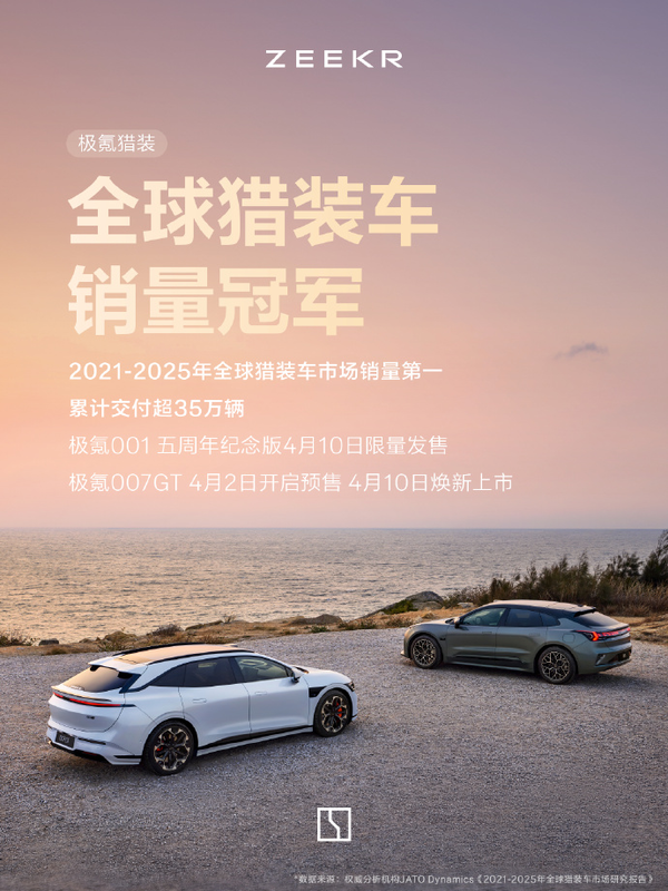 与此同时,极氪猎装车型也交出了一份颇具分量的成绩单。2021年至2025年,极氪在全球猎装车市场累计销量排名第一,累计交付超过35万辆。为纪念这一成就,极氪001五周年纪念版将于4月10日限量发售。