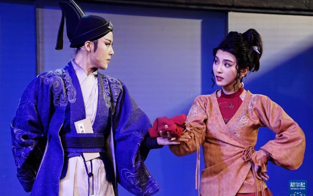 越剧演员陈丽君(左)和李云霄演出新编越剧《新龙门客栈》。图源:新华社