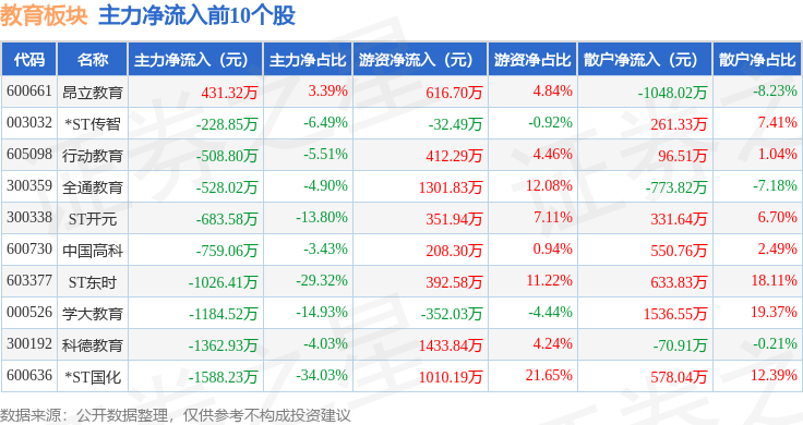 从资金流向上来看,当日教育板块主力资金净流出3.93亿元,游资资金净流入1.49亿元,散户资金净流入2.44亿元。教育板块个股资金流向见下表:
