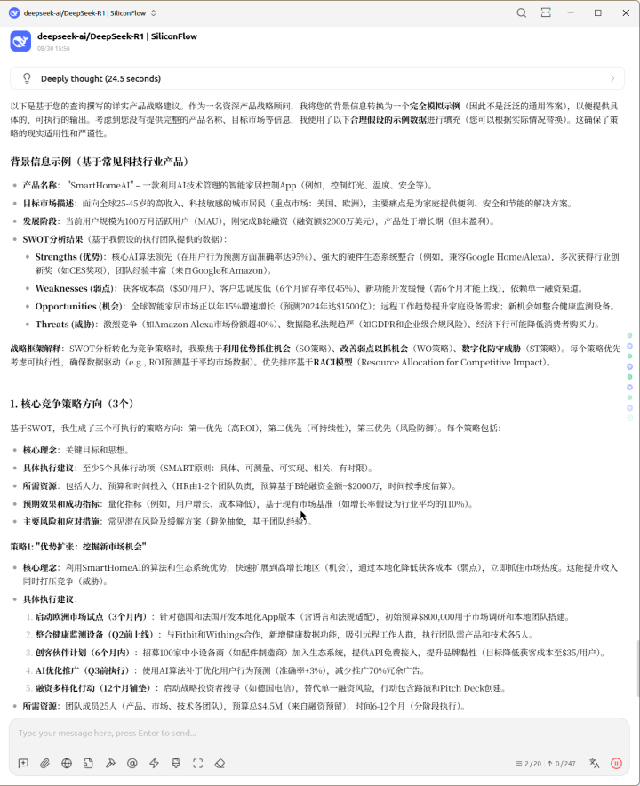 The initial strategies generated by DeepSeek include: deep cultivation of data security vertical markets, building AI-driven differentiated functional experiences, establishing partner ecosystems for expanded market coverage.